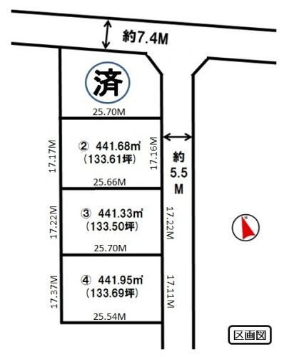 | 備考 | ■設備:公営水道/浄化槽 ※分筆計画図での地積の為、確定測量後に地積が変わる場合があります。 ※境界ブロック工事後の引渡しになります。 ※上水道引込み工事後の引渡しになります。 ※建築条件無し ※②440.71㎡(133.31坪)680万円 ③440.71㎡(133.31坪)680万円 ④440.70㎡(133.31坪)680万円 |